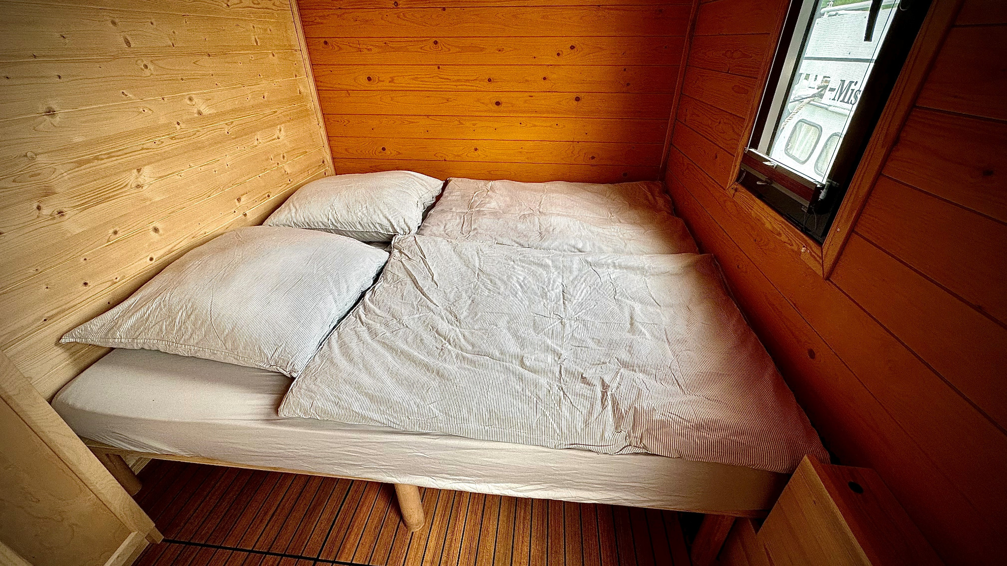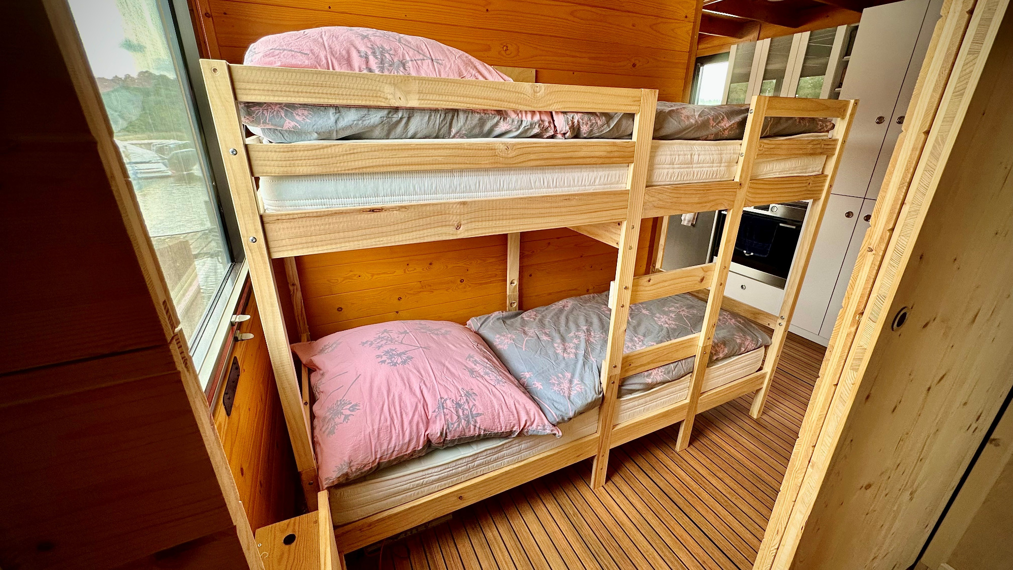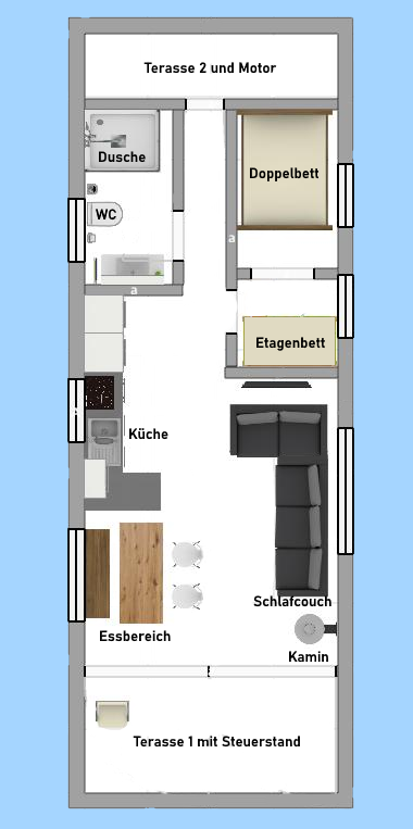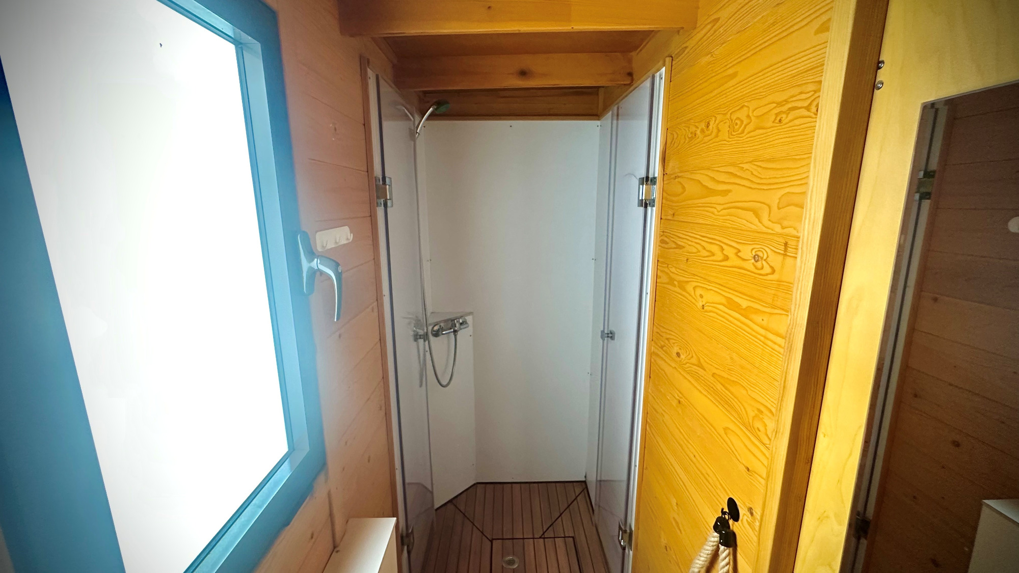 Das Hausboot bietet ein großes, geräumiges Bad, ausgestattet mit einer elektrischen Toilette und einer modern gestalteten Dusche. Ein eigenes Fenster sorgt für Tageslicht und eine angenehme Atmosphäre. Der Schlafplatz ist ideal für Familien oder Gruppen, da er mit einem komfortablen 1,80 m x 2,00 m großen Bett, einem praktischen Etagenbett und einer ausziehbaren Schlafcouch ausgestattet ist. Alle Räume sind durch Schiebetüren getrennt, die nicht nur Platz sparen, sondern auch eine gewisse Privatsphäre gewährleisten. Wie unsere Frieda aufgeteilt ist, sehen Sie auch in der Skizze