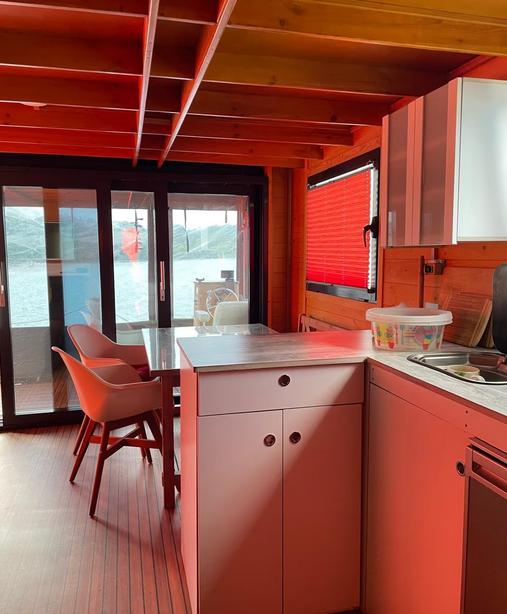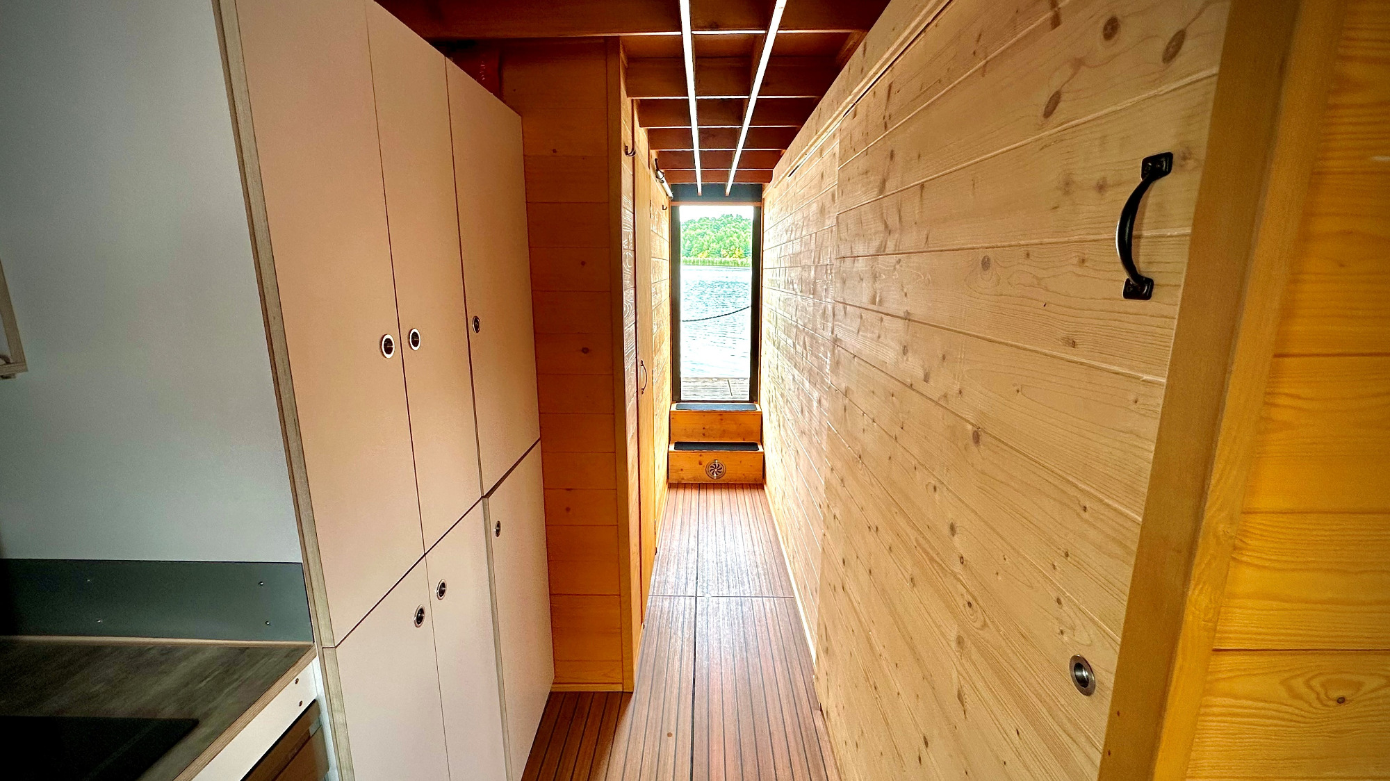 Die Innansicht eines Hausbootes besticht durch moderne Ausstattung und ein durchdachtes Raumkonzept. Die massive Einbauküche bietet viel Stauraum und ist mit hochwertigen Geräten ausgestattet, ideal zum Kochen und Genießen an Bord. An die Küche schließt sich eine gemütliche Sitzecke an, die zum Verweilen und entspannten Beisammensein einlädt. Eine bequeme Couch ergänzt das Gesamtbild und sorgt für zusätzlichen Komfort, perfekt, um nach einem aufregenden Tag auf dem Wasser zu entspannen und die Aussicht zu genießen.
