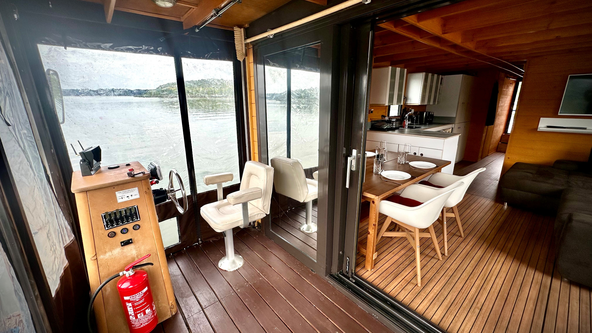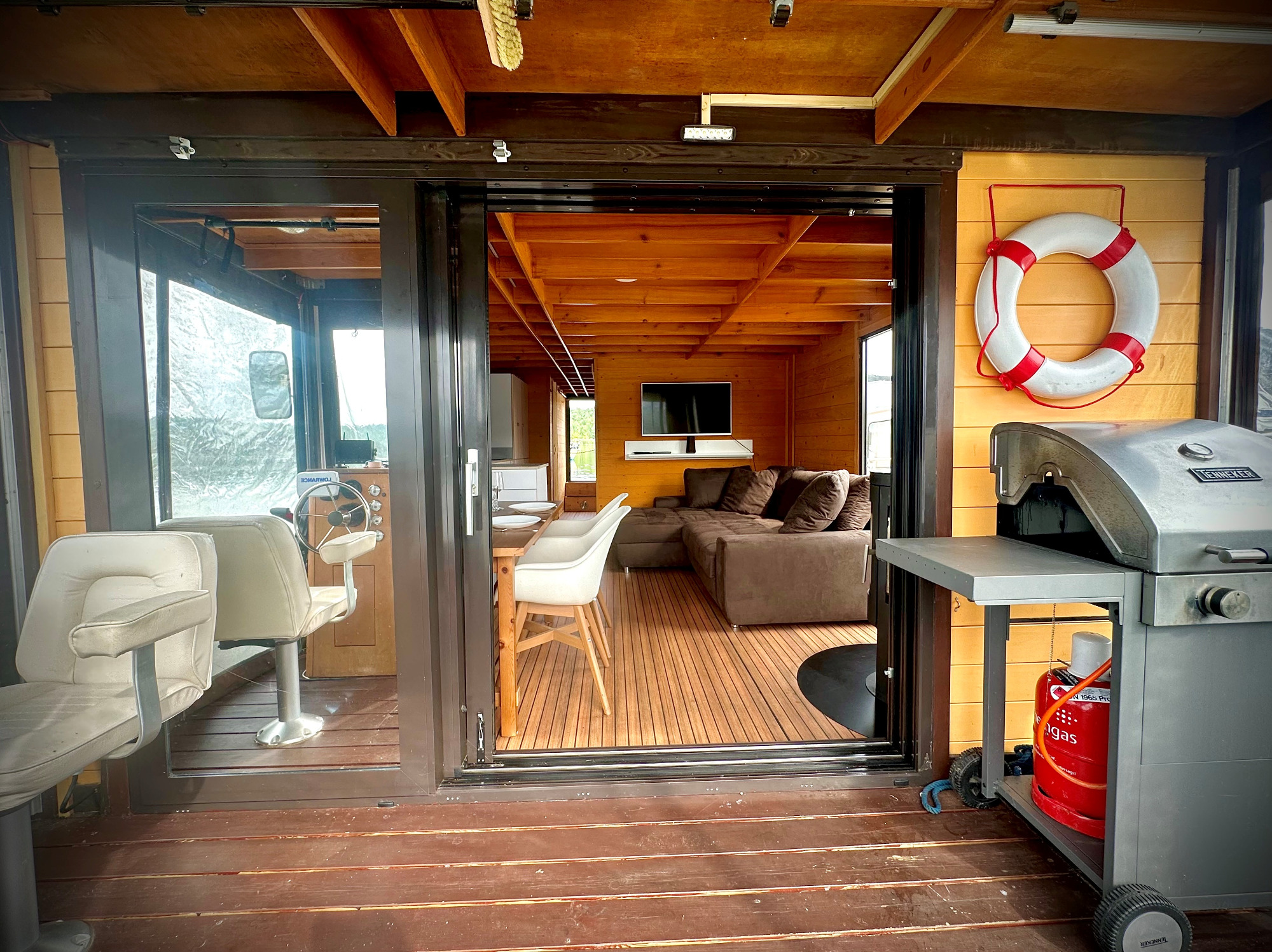 Hier sehen Sie die große überdachte Außenterrasse, die ideal ist, um die frische Luft und die schöne Aussicht zu genießen. Die bodentiefe Fenster sorgen für viel Tageslicht und bieten gleichzeitig einen beeindruckenden Blick auf das Wasser. Zudem lädt die zusätzliche Heckterrasse dazu ein, entspannte Stunden im Freien zu verbringen, während Sie das sanfte Plätschern der Wellen hören und die Natur um sich herum erleben.